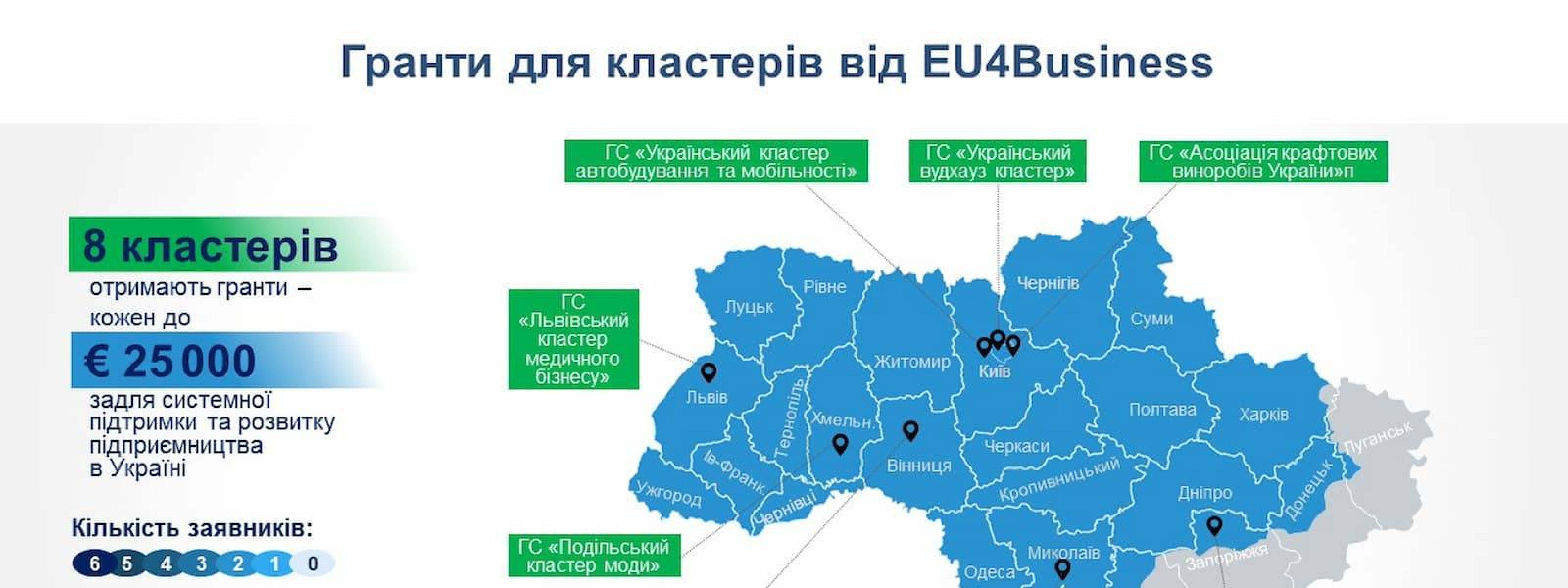 Усього на конкурсний відбір подали заявки 32 кластери з областей (підконтрольні Україні території): Вінницька (5), Дніпропетровська (1), Запорізька (1), Івано-Франківська (1), Київська (6), Львівська (4), Миколаївська (2), Полтавська (1), Рівненська (1), Сумська (2), Харківська (3), Хмельницька (3) та Чернівецька (2).