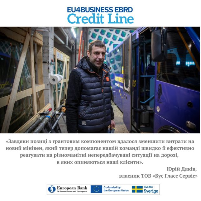 Кредитна лінія EU4Business-ЄБРР – це спільна ініціатива ЄС та ЄБРР для надання підтримки українським малим та середнім підприємствам (МСП) з метою фінансування їхніх інвестицій у модернізацію обладнання та устаткування. Деталі на сайті.