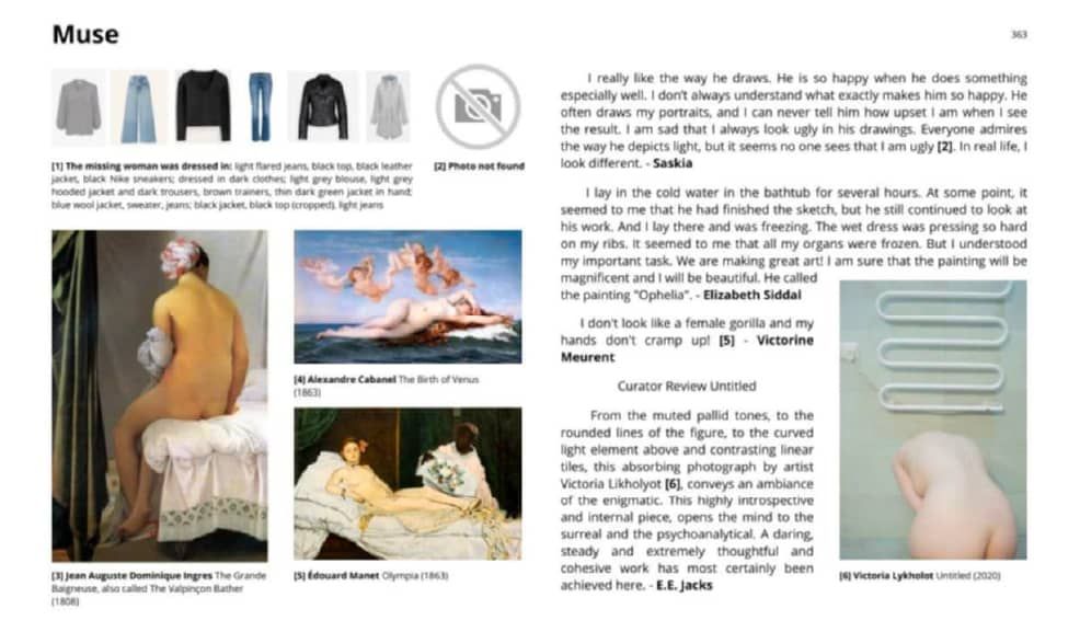 «Цей автопортрет мені часто порівнювали з «Купальницею» Енгра. З одного боку було приємно, що порівнюють з великими, а з іншого трохи обурює, що історія мистецтва – це енциклопедія чоловічих імен, – каже фотографиня. – Взагалі для мене поняття музи – це про анонімну участь жінок у мистецтві. І хотілося би зробити будь-яку жіночу присутність більше видимою. Зокрема, за допомогою виставки «100 жінок».