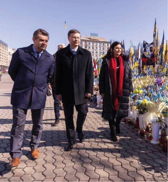 20 березня комісар Валдіс Домбровскіс відвідав Київ з нагоди перерахування траншу в сумі 1 млрд євро в межах кредитної ініціативи ERA під керівництвом G7. Він зустрівся з українськими високопосадовцями та запевних їх, що ЄС використовуватиме всі доступні засоби, щоб обмежити здатність Росії вести війну та змусити її нести відповідальність за руйнування, яких вона завдала Україні. Пан Домбровскіс разом із пані Послом ЄС в Україні Катаріною Матерновою та заступником Міністра закордонних справ Євгеном Перебийносом вшанували пам’ять загиблих героїв України.